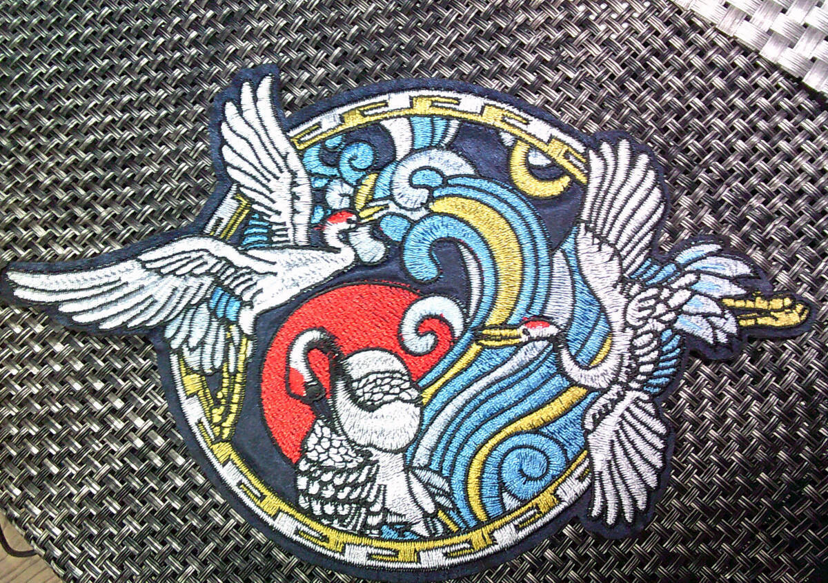 > 《圧着■大型三羽飛翔白鶴》■ レトロデザイン◆激渋 鶴 荒波 太陽 迫力満点 江戸時代 明朝 清朝 刺繍ワッペン(パッチ)【DIY リメイク】