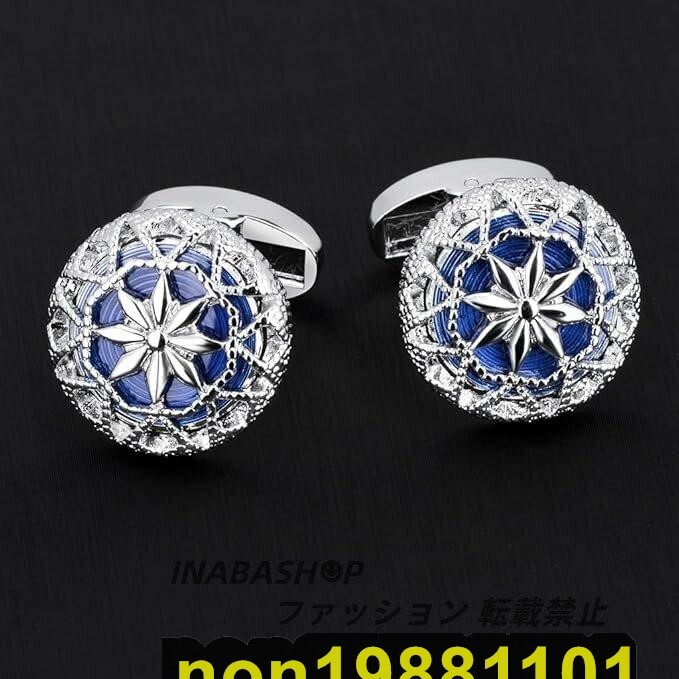 - カフス シルバー 透かし彫り ブルー 花柄カフスラウンドカフスボタン 仕上げ 紳士 ビジネス プレゼント カフリンクス アクセサリー