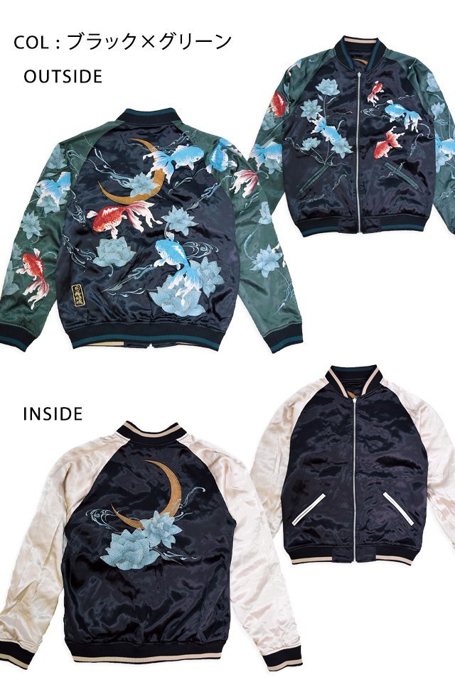 - 粋 金魚蓮流水リバーシブルスカジャン◆絡繰魂 ブラック×ダークグリーン XLサイズ 252856 和柄 和風 刺繍 きんとと スーベニアジャケット