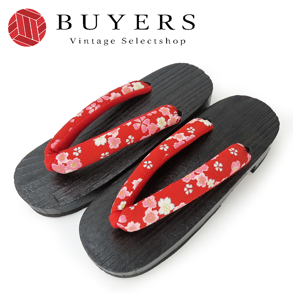 - 中古 下駄 未使用展示品 フリーサイズ ポリエステル 桐 赤 ピンク系 黒 浴衣用 桜柄 かわいい 和装 呉服 和服 きもの レディース 女性