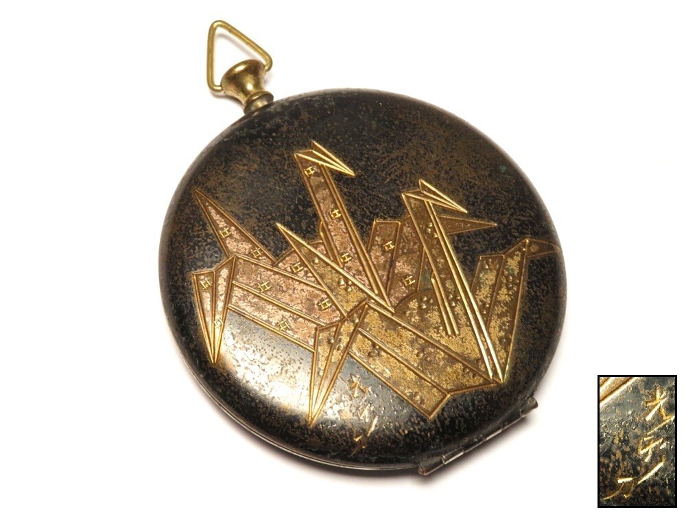 - 【9810】明治期 金工美術 懐中時計風 コンパクト 折り鶴 彫金 在銘(初品・買取品)
