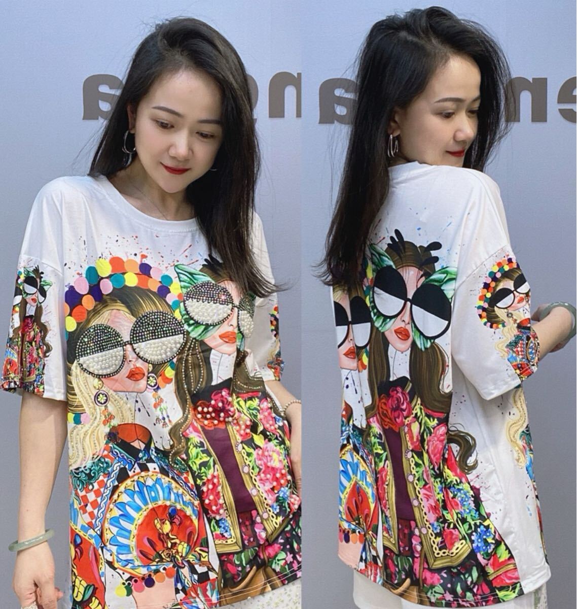 - Tシャツ 半袖 サングラスガール キラキラパール付き ラインストーン ホワイト 大きいサイズ