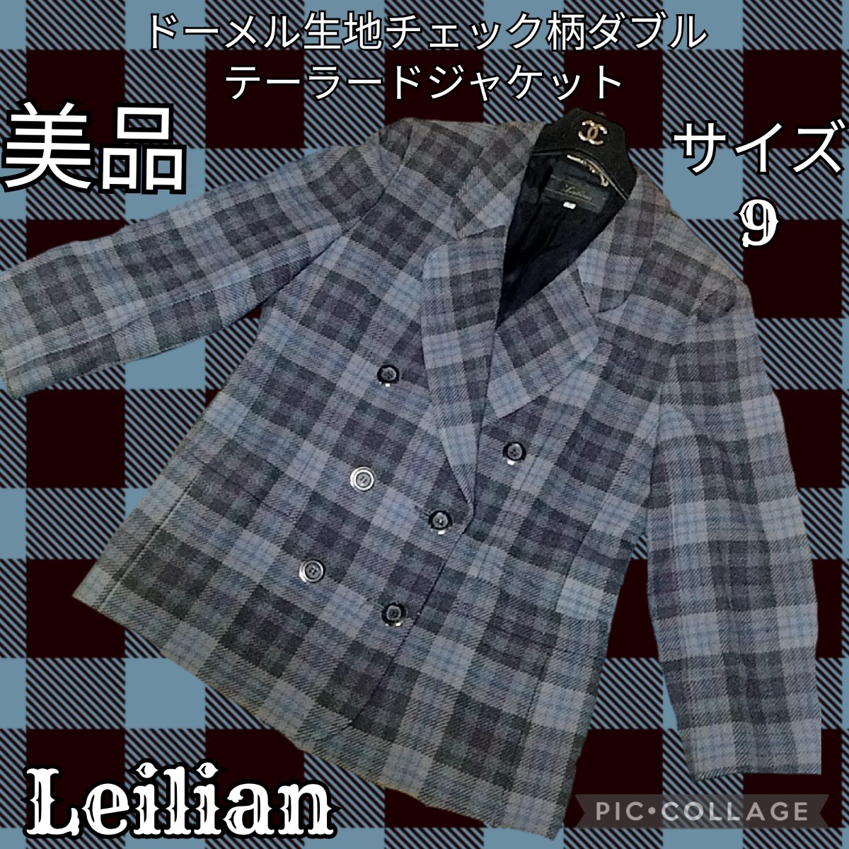 > 美品★Leilian★レリアン★ドーメル生地★テーラードジャケット★チェック柄★DORMEUIL★e.sports★ダブル★ブルー★高級★金ボタン★秋冬