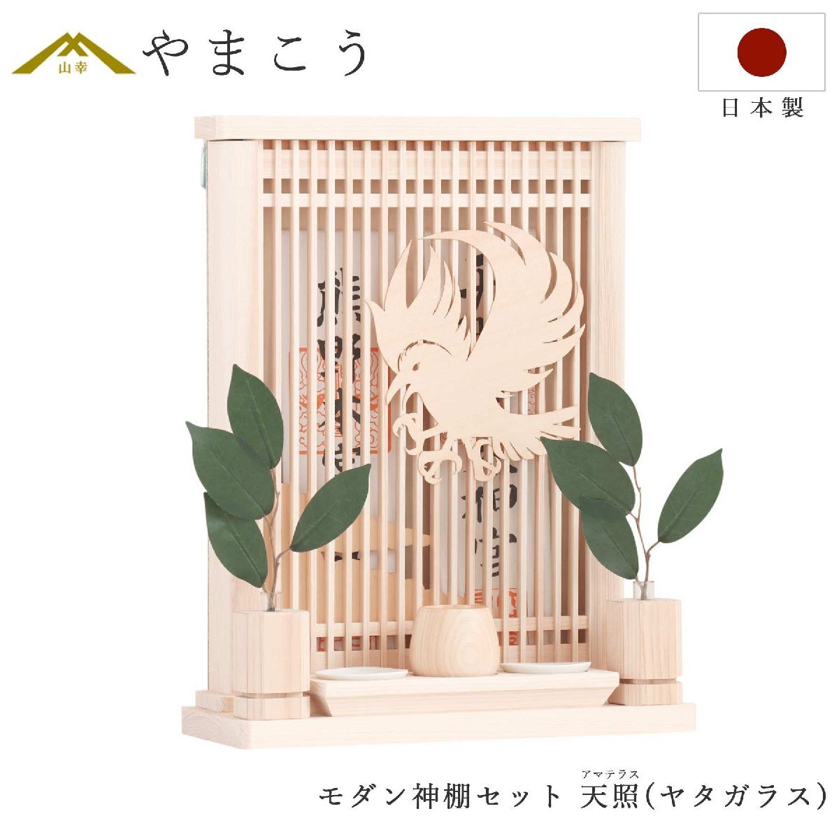 - モダン神棚 アマテラス ヤタガラス ミニ 天照らす八咫烏 箱宮 お札立て 神具セット コンパクト 壁掛け 御朱印帳 お守り入れにも
