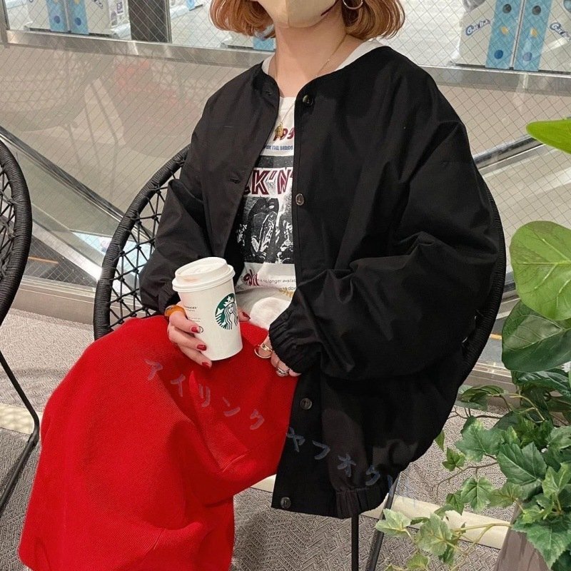- 黒のジャケットアウターゆったり大きいサイズ長袖 ブルゾンノーカラージャケットお尻も隠れちゃうお色選択可