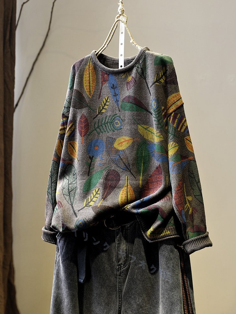 > ニット セーター ゆったり トップス チュニック フリーサイズ ナチュラル風 プリント葉っぱ柄4 綿100% コットン クールネック茶色
