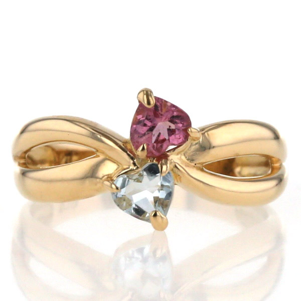 > K18YG イエローゴールド リング アクアマリン ピンクトルマリン ダブルハート リボン 指輪 9号【新品仕上済】【zz】【中古】