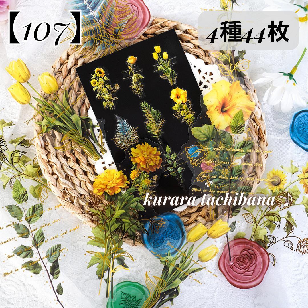 > 【107】シール ステッカー 花 PET コラージュ素材 箔押し アルバム ジャンクジャーナル スクラップブッキング 装飾 4種44枚