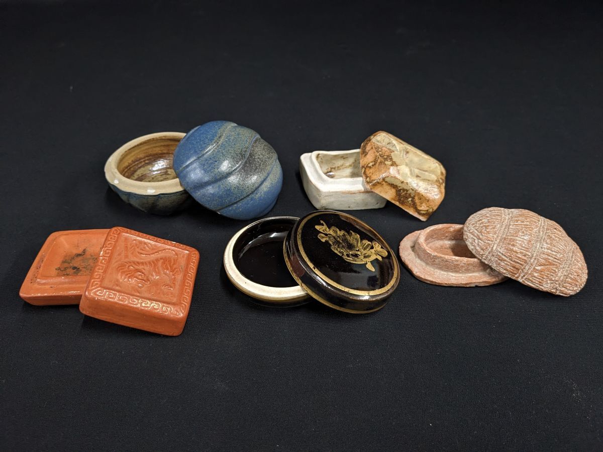 - Q736 【香合まとめて5点 稚耕造等在銘品】 虎篆刻/黒地金彩/信楽焼/内原野焼/総重量約657g/60