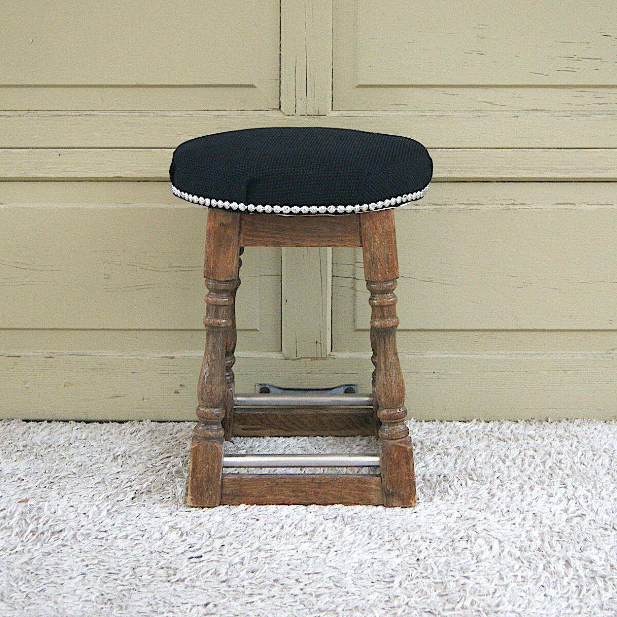 - 4641h3+【古い 木製スツール 丸椅子 リペア 布張り+鋲止めで 1点モノのクラシックモダンに】アンティーク ヴィンテージ