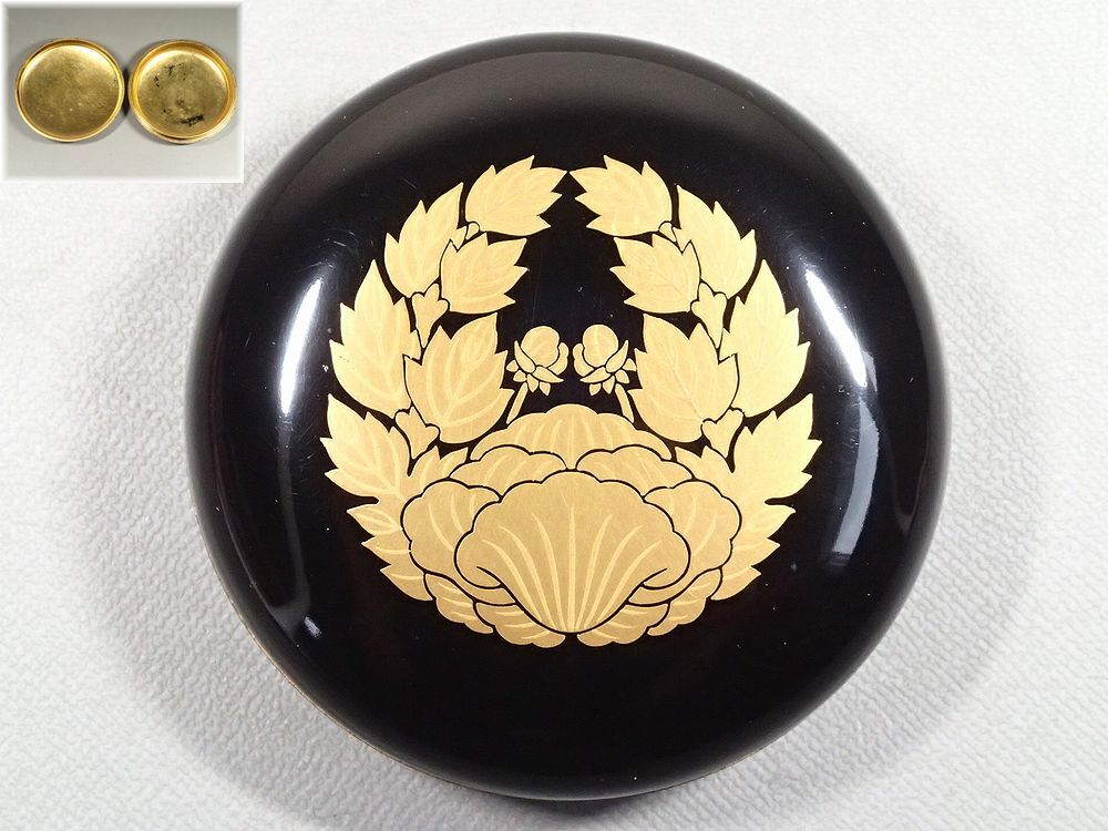 - 香合 黒漆塗 内鍍金 抱き牡丹紋 家紋 桐箱入り 茶道具 仏教美術