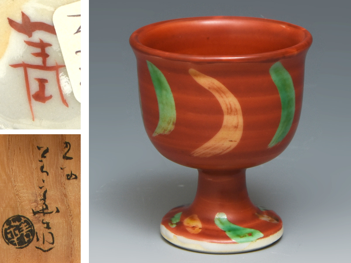> 九谷 須田菁華 (造) 色絵 高盃 高:6cm 酒盃 酒器 猪口 杯 会席 懐石道具 茶道具 陶磁器 u0121t