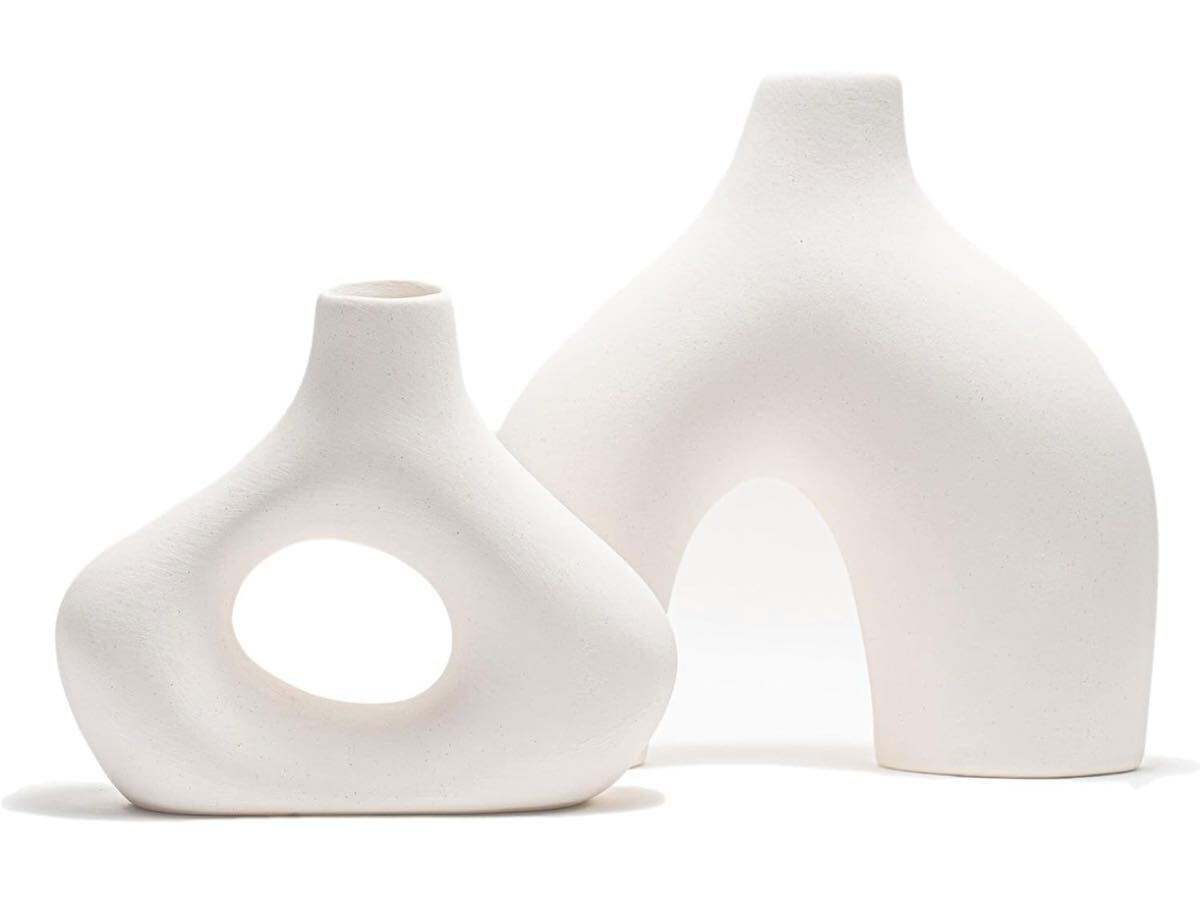 - 花瓶 フラワーベース 素焼き 陶器 マット デザイン アート オシャレ インテリア 2点セット (ホワイト)