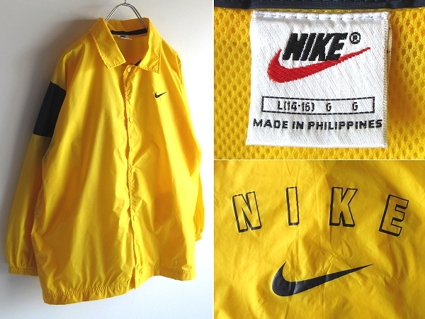 > 90sビンテージ 白タグ NIKE ナイキ スウォッシュロゴ刺繍 バックプリント ナイロンジャケット コーチジャケット KID'S L(メンズS-M位) 黄黒