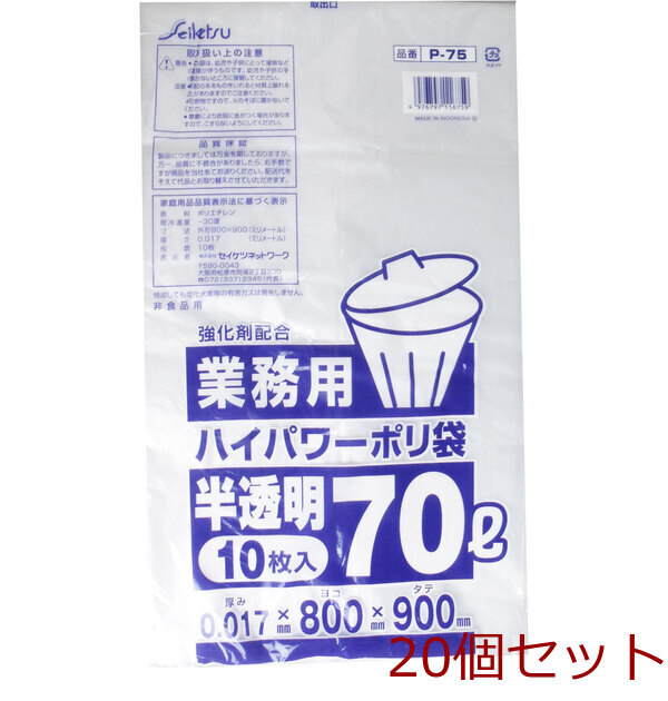 - 業務用ごみ袋 ハイパワーポリ袋 半透明 70L 0.017×800×900mm 10枚入 20セット