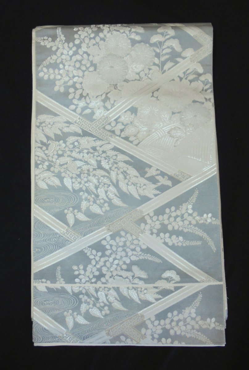 > 5226 【リサイクル・美品】 正絹 袋帯 「白銀/灰・萩と菊」-