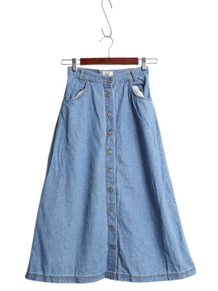 - 90s リーバイス デニム スカート レディース XS 古着 オールド コットン ボタン 前開き ミモレ丈 ひざ下 Aライン タックなし 薄手 白タブ