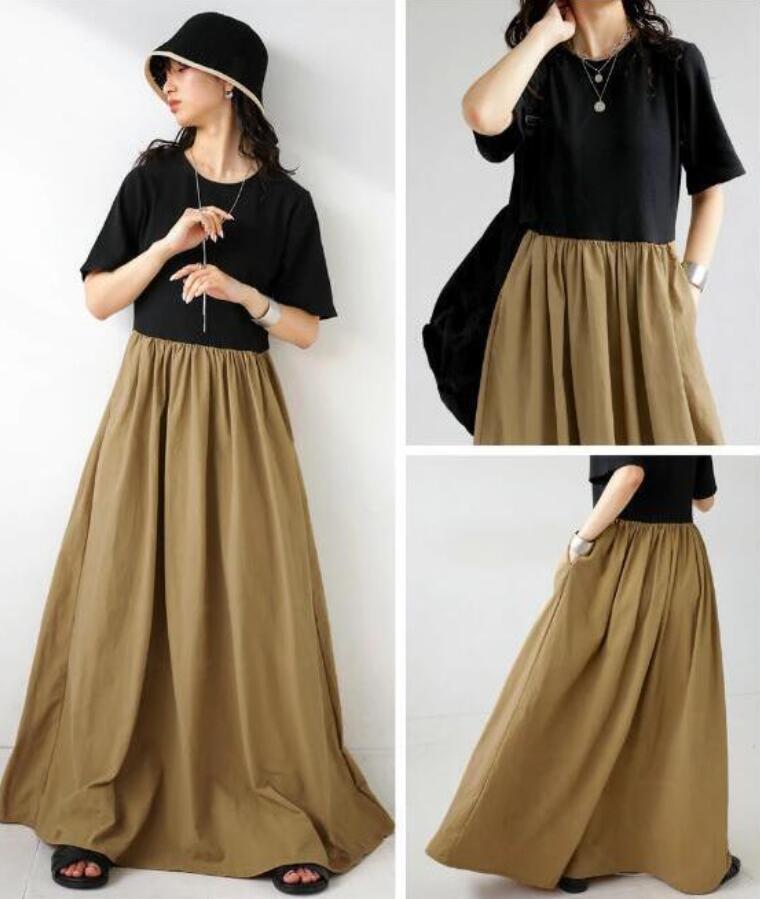 > 人気推薦/ ロングワンピース ナチュラル ゆったり 切り替え 配色 半袖 マキシワンピース ポケット付き ハイウエスト 着やせ 大人
