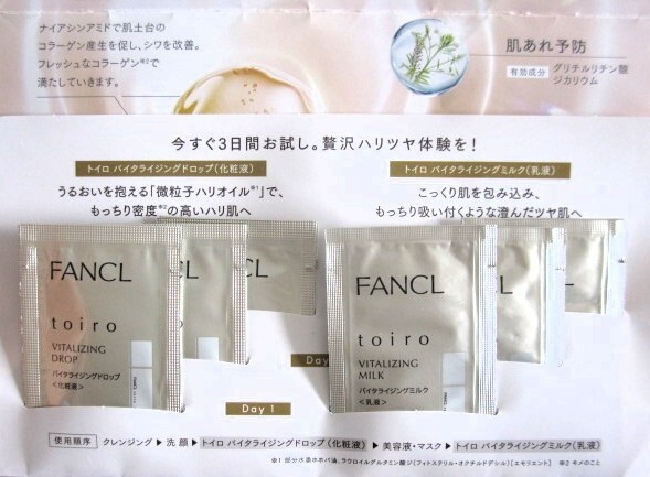 - ★ファンケル★化粧水6パック&乳液6パック★3日分★サンプル★コラーゲンに鮮度★ワンランク上の素肌★toiro VITALIZING★トイロ業界初