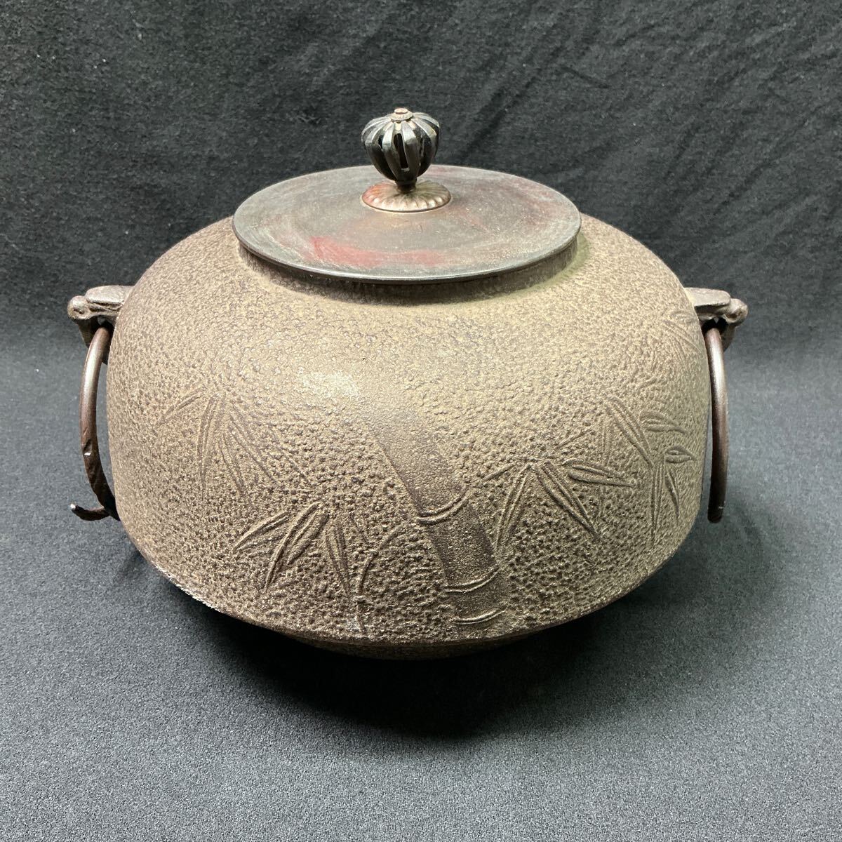 - 【B106】送無 高橋敬典造 鉄釜 切合田口釜 茶釜 銅蓋 獣耳 竹笹紋 釜鐶 在銘 鉄瓶 茶道具 古民具 美品