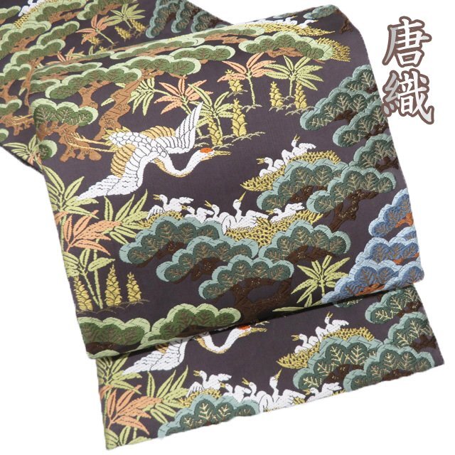 - 特選 袋帯 中古 リサイクル 正絹 フォーマル 仕立て上がり 六通 唐織 松竹に鶴の図 箔糸 涅色 多色 金 きもの北條 A1187-14