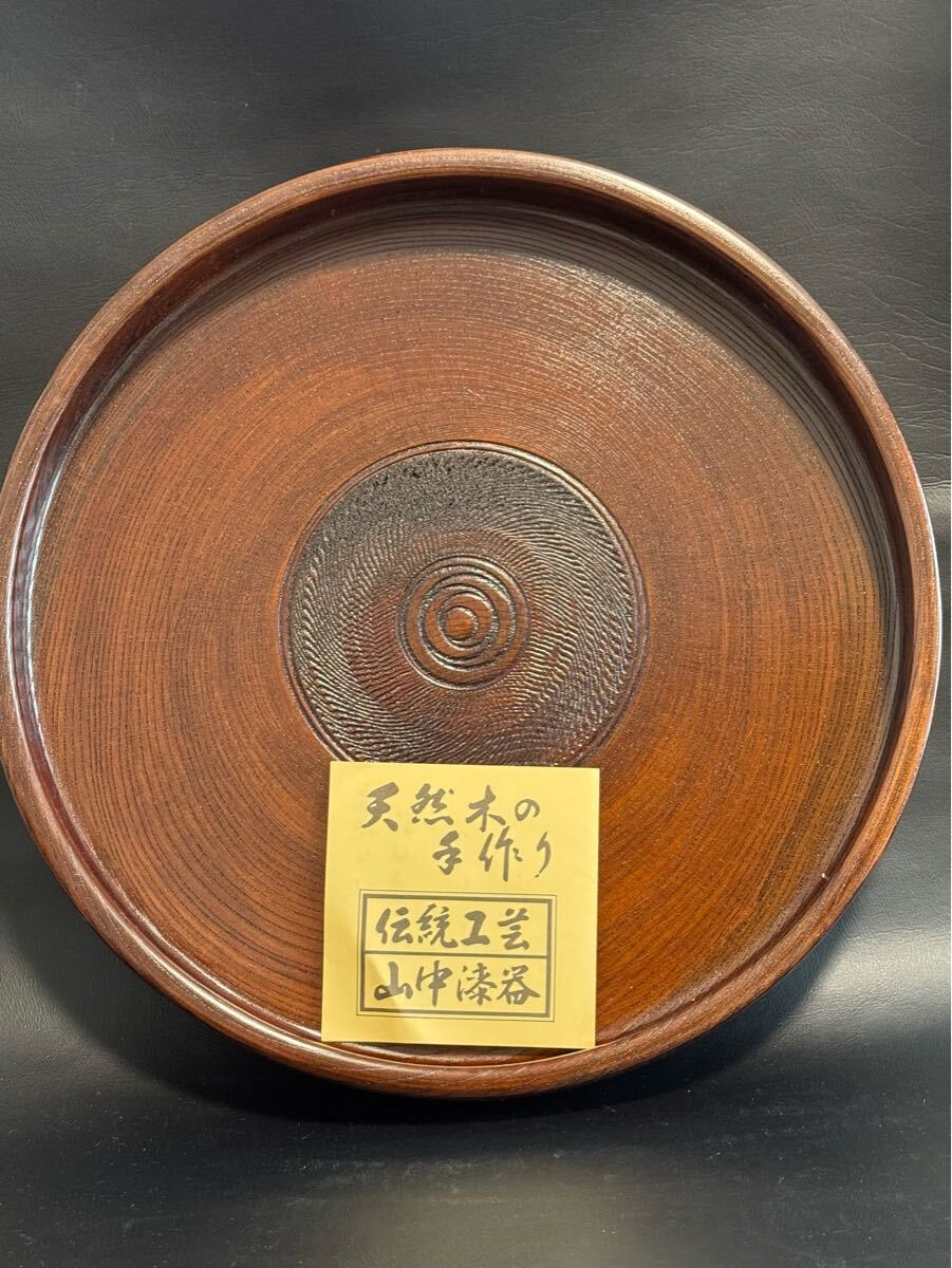 > 未使用品 天然木の手作り 伝統工芸 山中漆器 漆塗 お盆 盆 木製 アンティーク 昭和レトロ 和食器 大皿 皿 直径29cm 丸盆 茶道具 煎茶盆