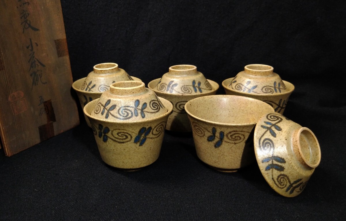 - 「窯変小茶碗五個」 窯変 草花文 蓋付茶碗 5客揃 時代箱 蓋付向付 bse-57b4370-cr