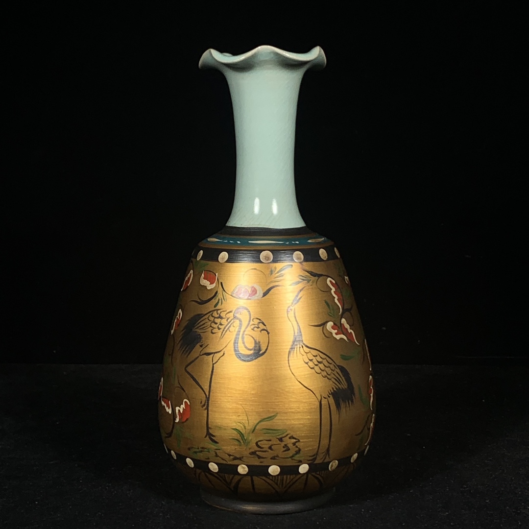- 蔵友旧蔵出 宋 汝窯 銘文 彩繪 仙鶴紋 花口瓶 古陶瓷品 置物 古賞物 中国古玩 中国古美術品