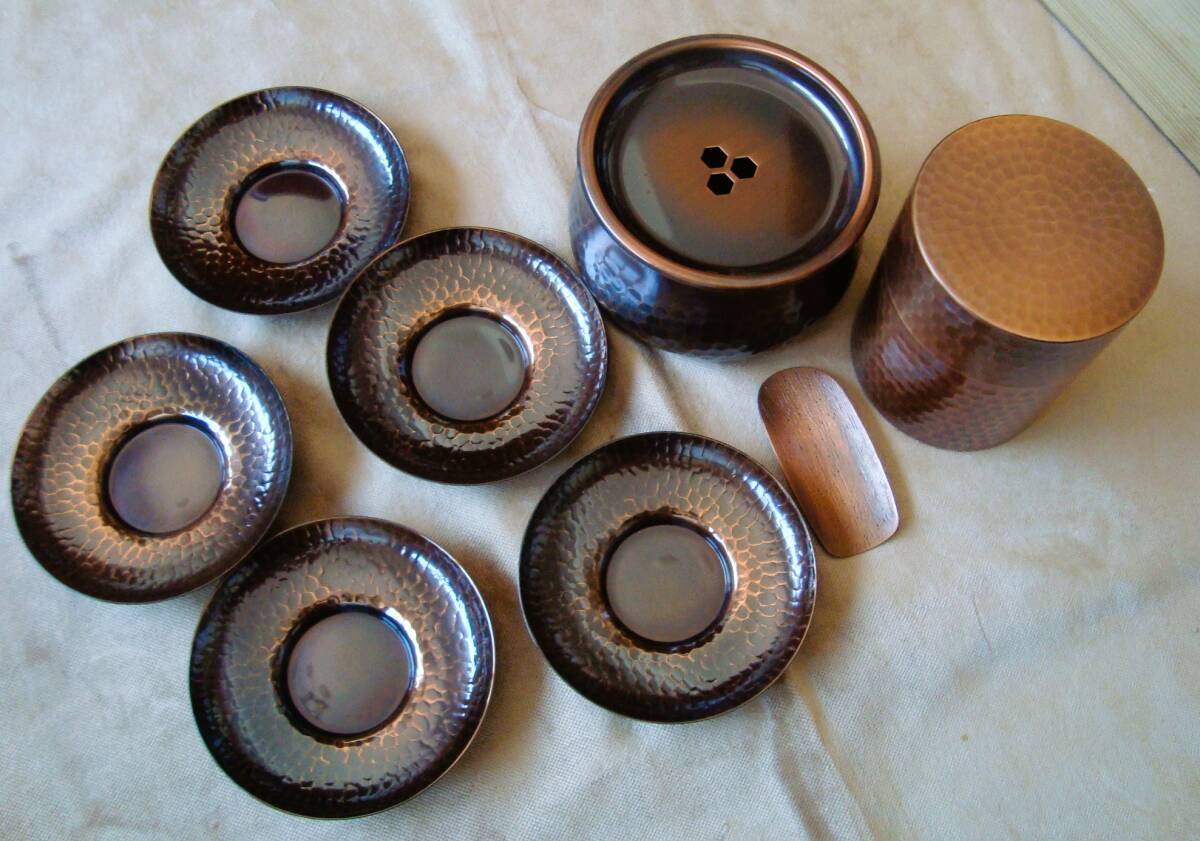 - 茶器セット 茶筒 茶こぼし 匙 茶托5枚 純銅製 桃山古式 鎚起銅器