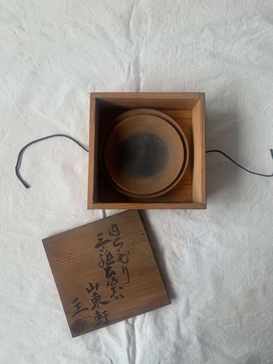 - 旧家蔵出し 専用木箱入り デザインが素敵な素焼き小皿大小2枚セット コレクション古道具古物骨董古美術アンティークコレクションインテリア
