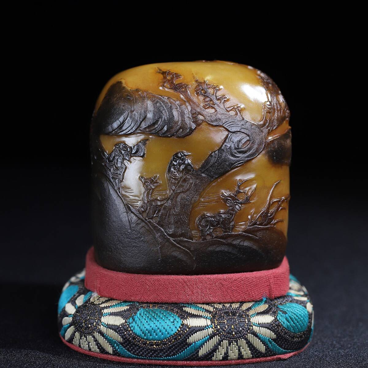 - 【超珍館蔵】寿山石 烏鴉皮 田黄石 細密彫 人物故事紋印章 箱付 文房具 書道品 古賞物 古美術品 稀少珍蔵品