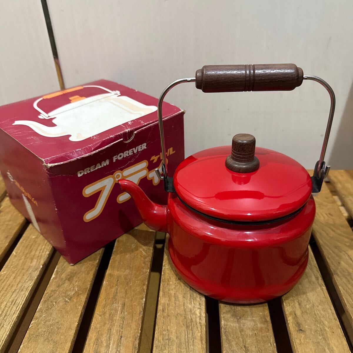 - 未使用 ウッドハンドル ホーロー 小ぶりなケトル ポット ビンテージ!ソロキャン