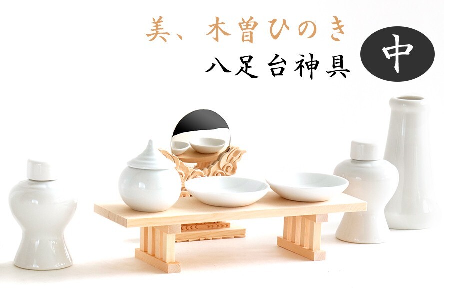 - 美・木曽ひのき ■ 神具セット 9点 ■ 中型 ■ 特上の 神鏡 2寸 八足台 8寸 ■ 神棚 木曽桧 神棚セットに
