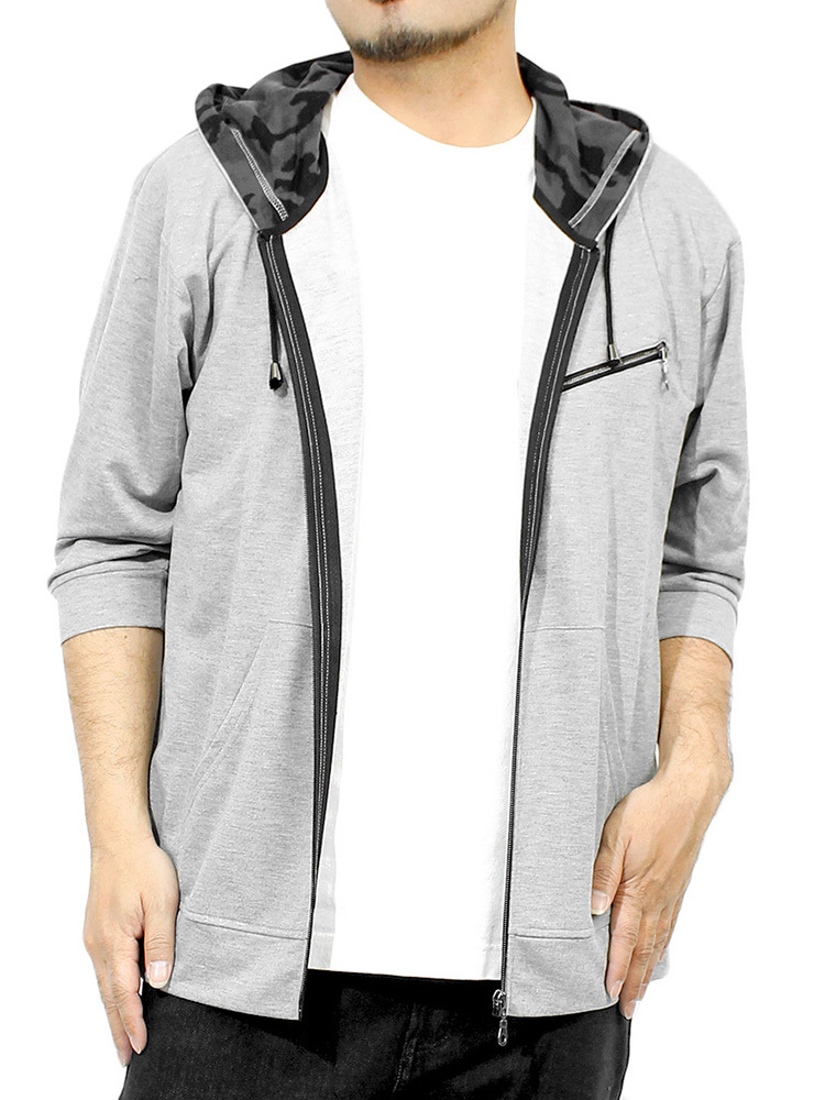 > 【新品】 2L グレー 7分袖 パーカー メンズ 大きいサイズ 半袖 長袖 カモフラ 迷彩 薄手 ジップアップ ゆったり ジップアップパーカー