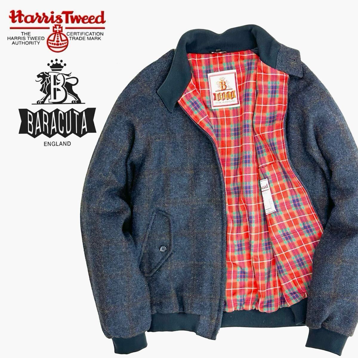 > 美品!!英国製 BARACUTA Harris Tweed G9 羊革 ネイビー チェック柄 スイングトップ ジャケット(40)ブルゾン バラクータ ハリスツイード