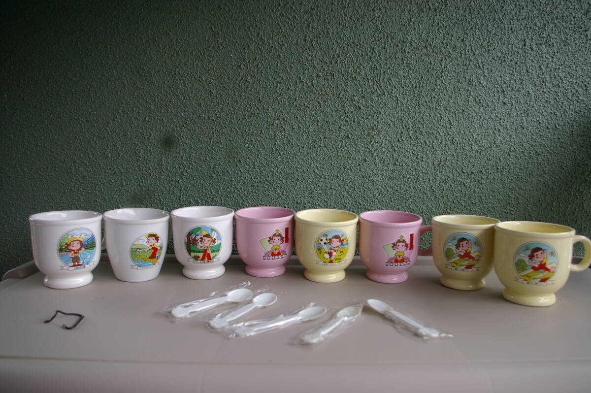 - ★★レトロ 不二家ペコちゃんコップ8個、スプーン5本 カップ プリンカップ