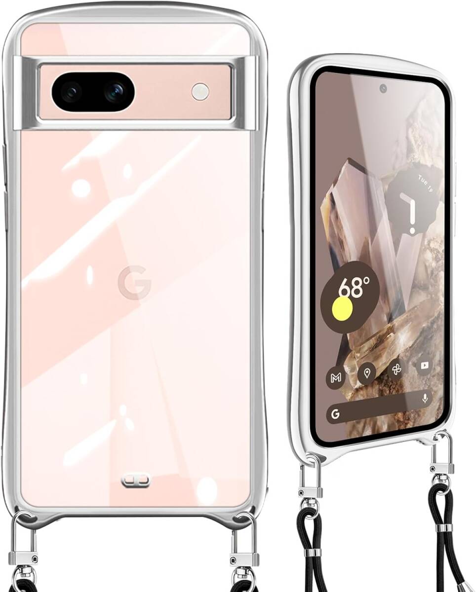 - Google Pixel 8 ケース ショルダー クリア ストラップ付き 肩掛け 首掛け 縄掛け 斜めがけ 紐付き 耐衝撃 透明 TPU メッキ加工 シルバー