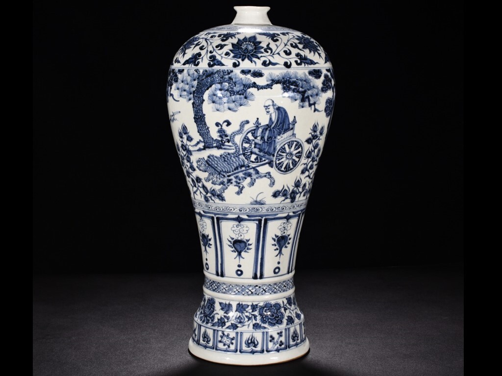 - TA343■中国古玩 唐物 元青花・鬼谷下山人物故事紋蓮座梅瓶 菱口折沿盤・極細工 古賞物 ■高さ51cm・直径21cm■