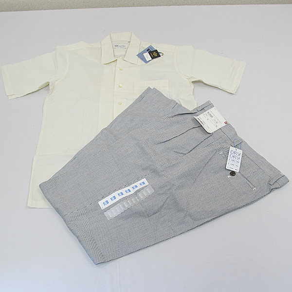 - ユニクロ ドライコードレーン2タックパンツ W82㎝+Stock&Home 薄手半袖シャツ M クリーム系/未使用2点まとめて 難ありシャツにシミ