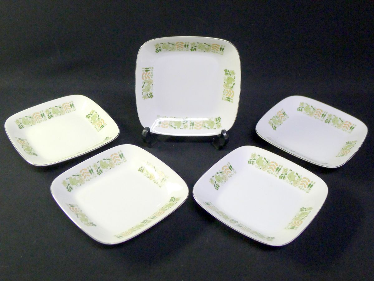 > e◆320 昭和レトロ NARUMI CHINA ナルミ チャイナ 金縁 グリーン 草花柄 中皿 角皿 5客揃 洋食器 /60