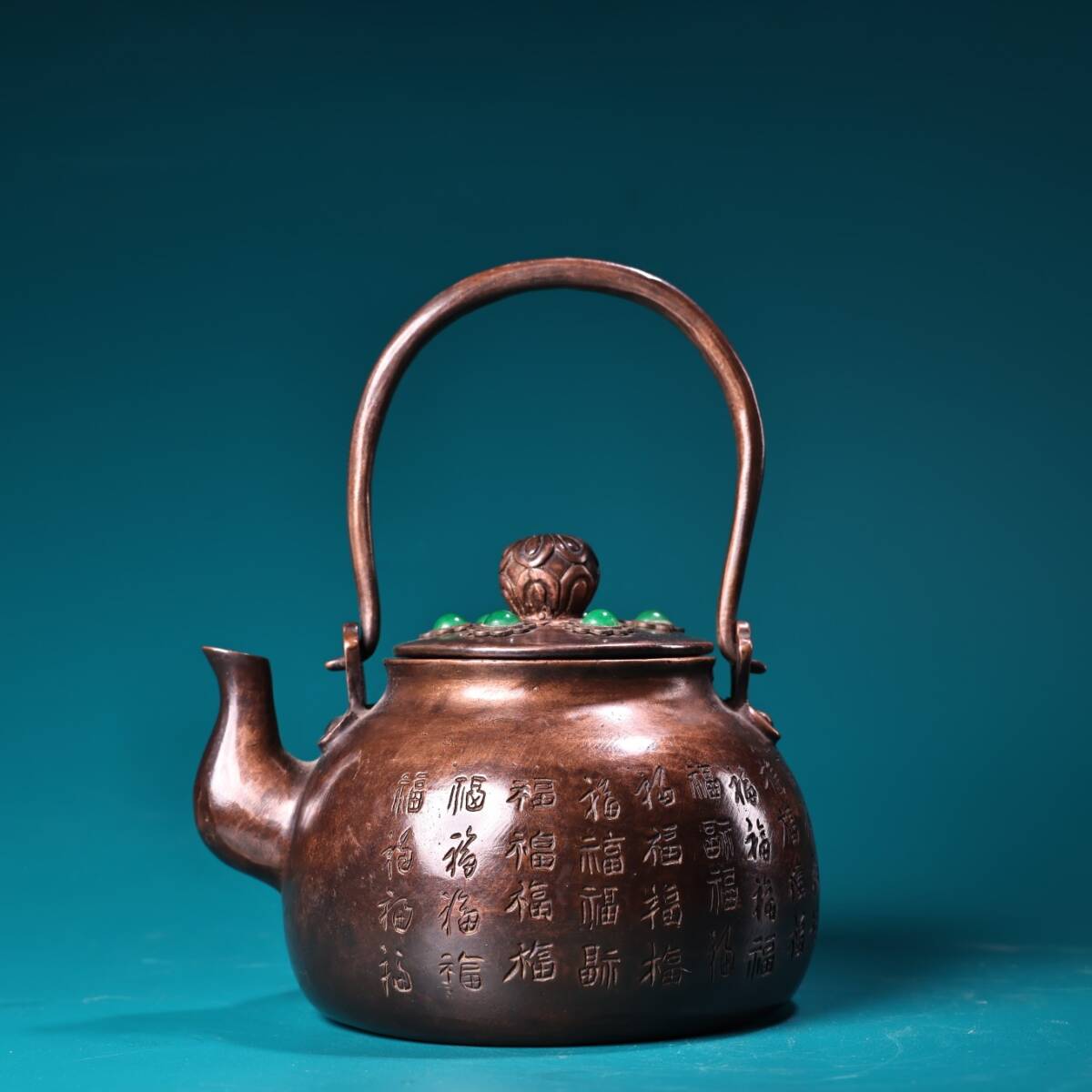 - 民国時期 古銅彫 銅壺 煎茶道具 宝石嵌 詩文 茶壺 酒壺 急須 極細工 置物擺件 古美術品 時代物 古賞物 古董品 収集 旧家蔵出 中国唐物