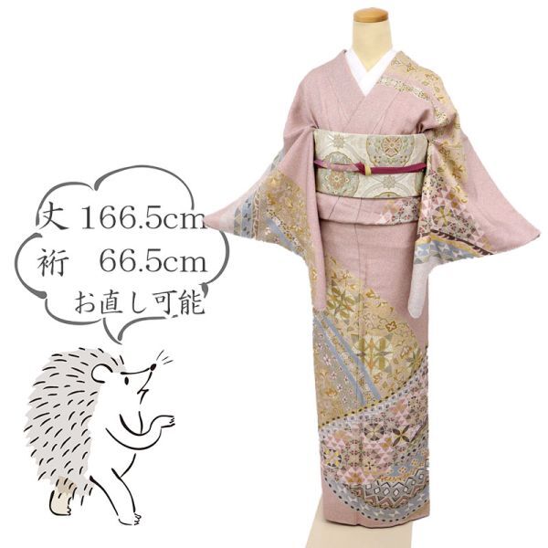 > 【訪問着】 長尺 花唐草モザイク柄 鴇浅葱ピンク 背紋有 袷正絹着物 レディース HP3-6