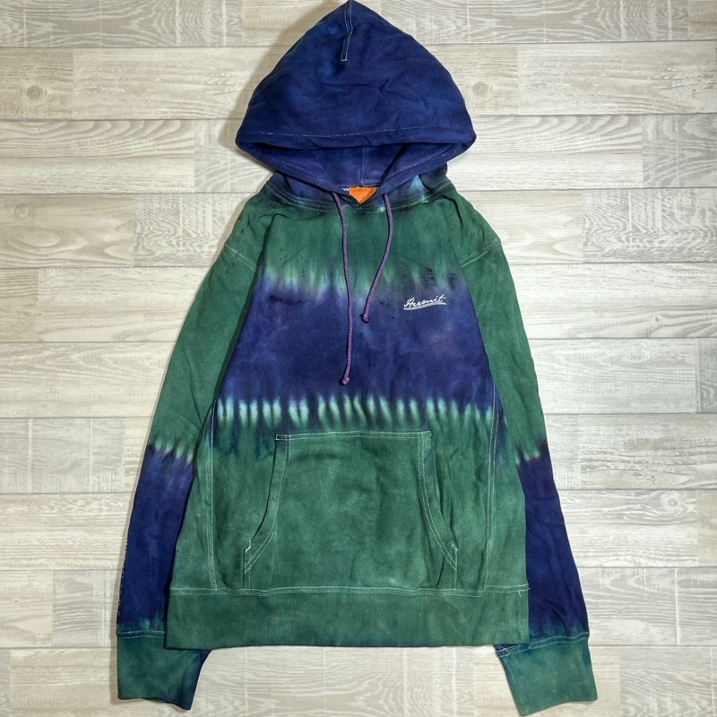 > HERMIT/ハーミット/Tie Dye Hoodie/タイダイフーディ/プルオーバーパーカー/ムラ染め/ネイビー×グリーン/袖モールス信号刺繍