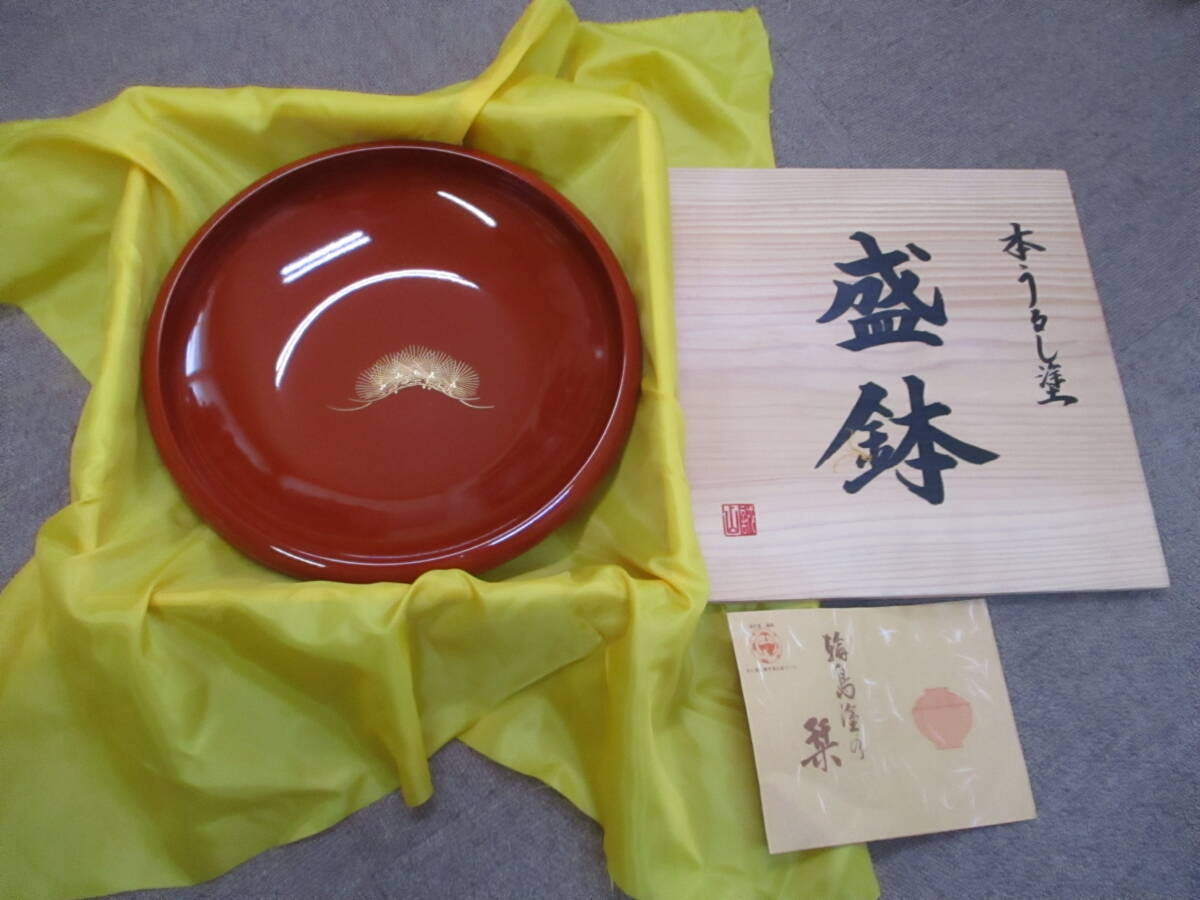 - 未使用桐箱入り★輪島塗 日立木質 本うるし塗 金彩松図 盛鉢 菓子鉢★80