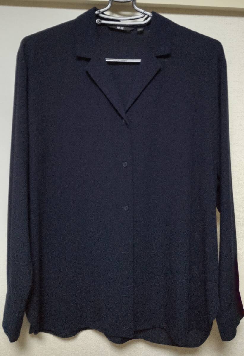 - 新品同様【ユニクロ】開襟ブラウス/開襟シャツ/Lサイズ/濃紺/若干透け感あり/ユニセックス