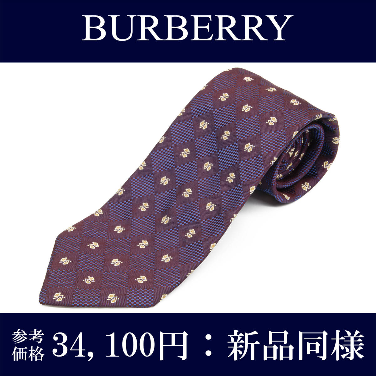 > 送料無料 バーバリー ネクタイ ジャガード 新品同様 シルク 赤紫 バーガンディー ネイビーブルー アイボリー 四角 マーク 光沢 綺麗 N914