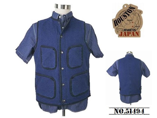 - 【送料無料 42%OFF】 HOUSTON ヒューストン インディゴ刺子 ワークベスト 日本製 NO51494 VINTAGE WASH_Lサイズ