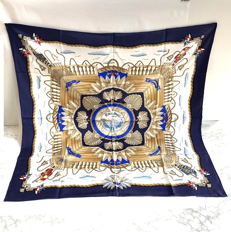 - 【即決】 HERMES エルメス カレ90 大判スカーフ RAILING 船の手摺 シルク ブルー 青 ホワイト 白 絹