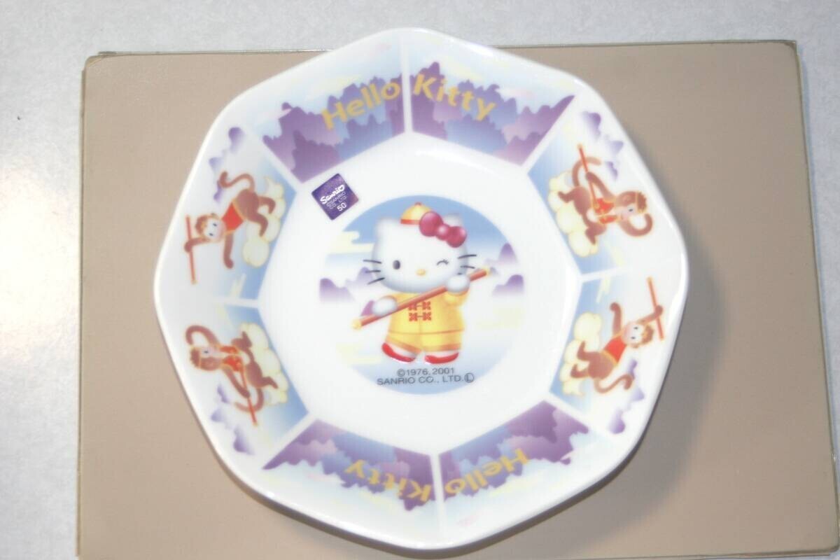 - サンリオ ハローキティ 飲茶がいっぱい 中華皿 八角皿 絵皿 2001年 チャーハン皿 陶磁器 猿 サル