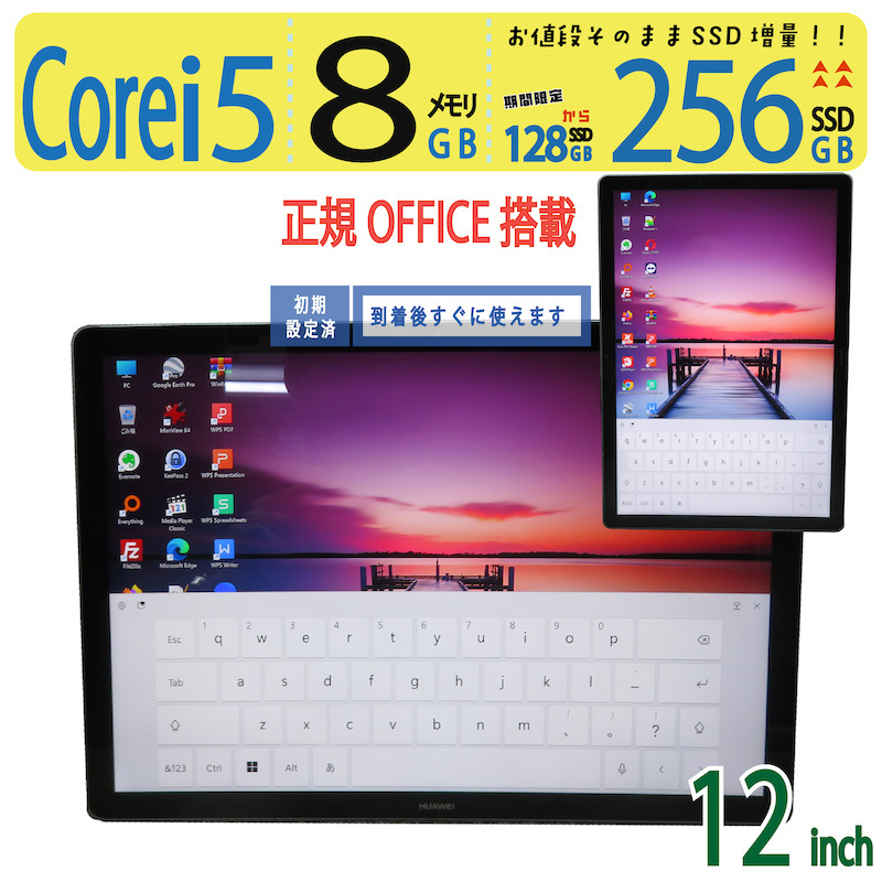 > 【タッチパネル 操作感◎】◆HUAWEI MateBook E BL-W19 / 12型 ◆ Core i5-7Y54[省電力] / 256GB SSD / メモリ8GB ◆ win11 / 正規 Office